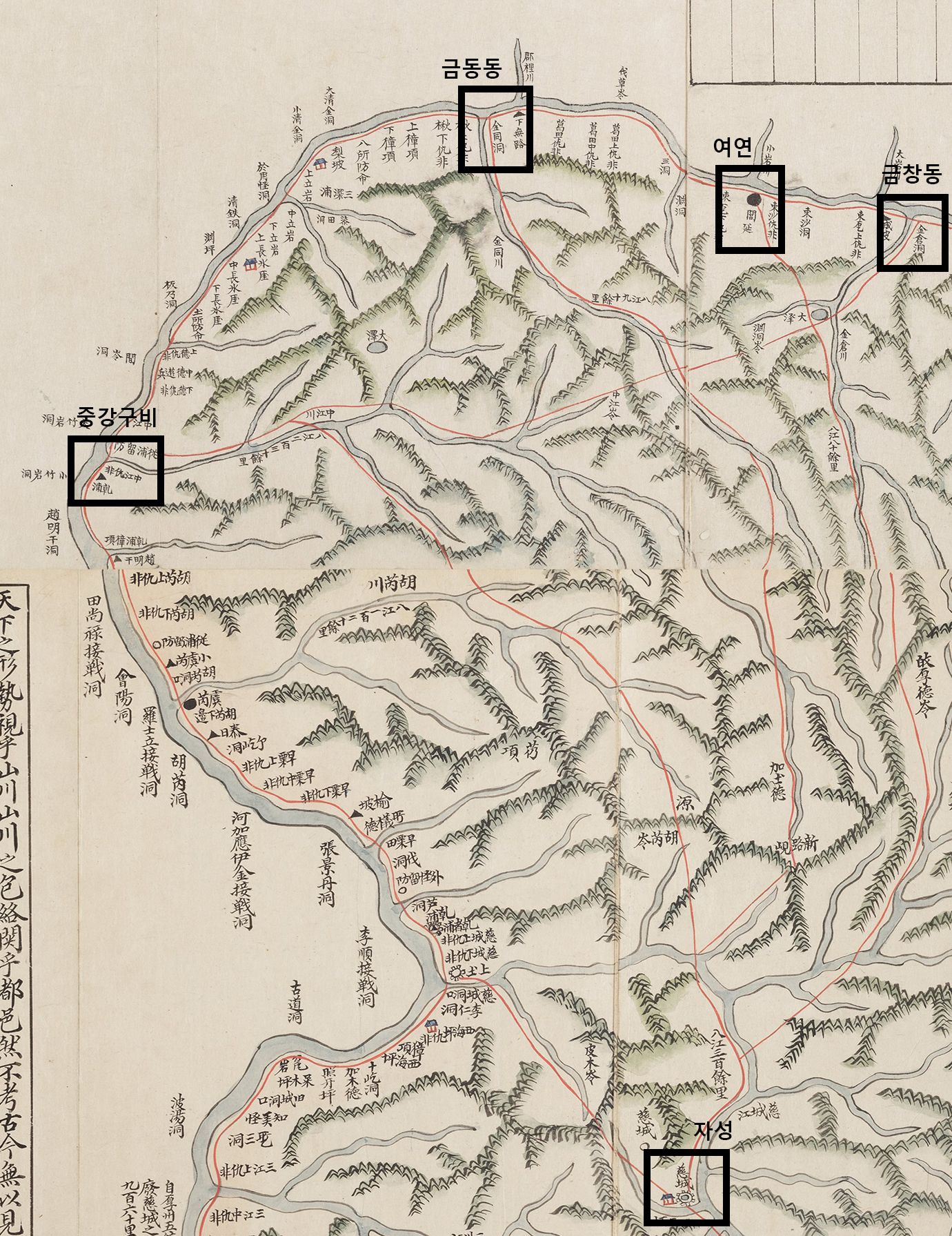 <그림 1> 동여도의 압록강 상류 자성, 여연 등지 부분 확대