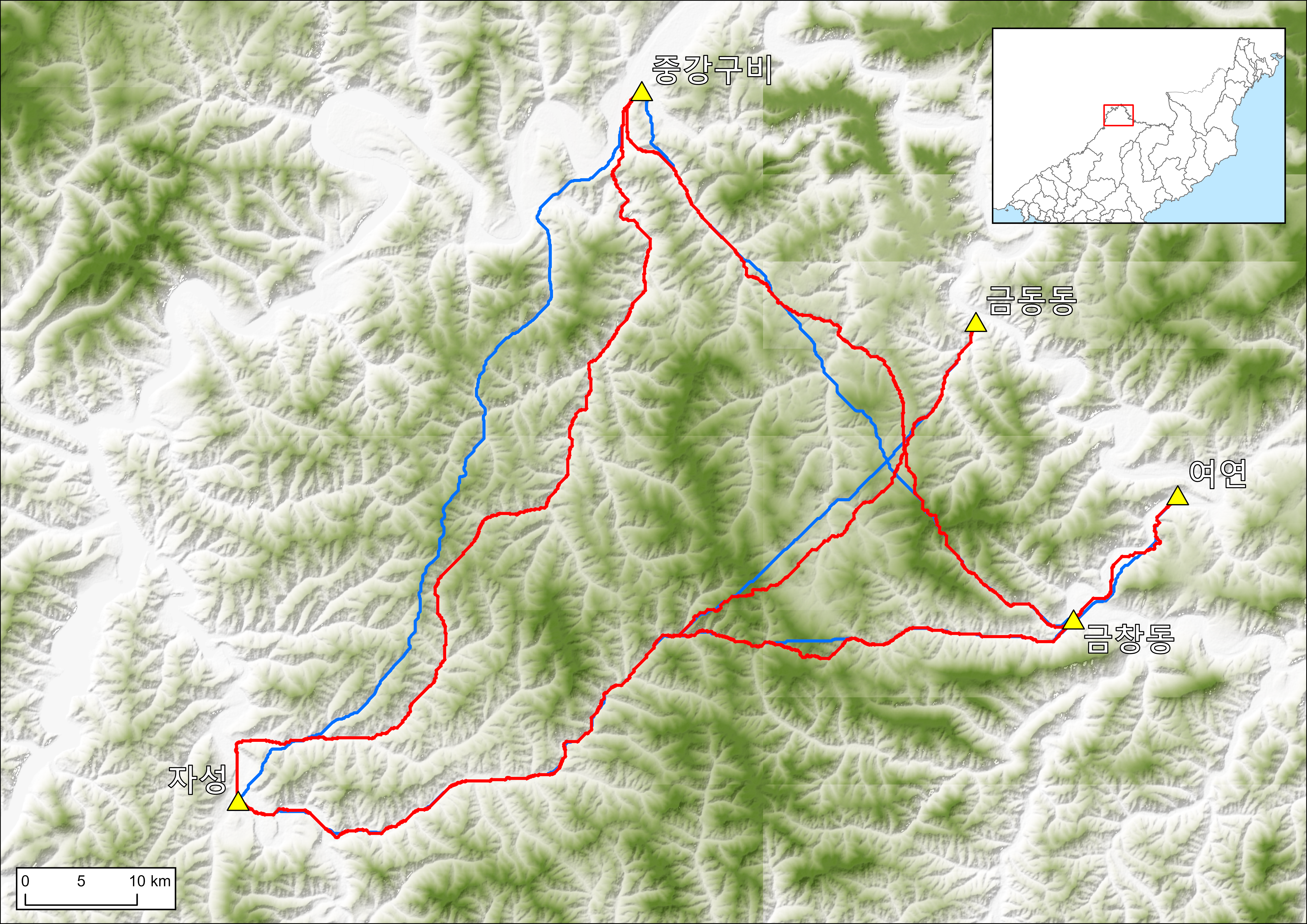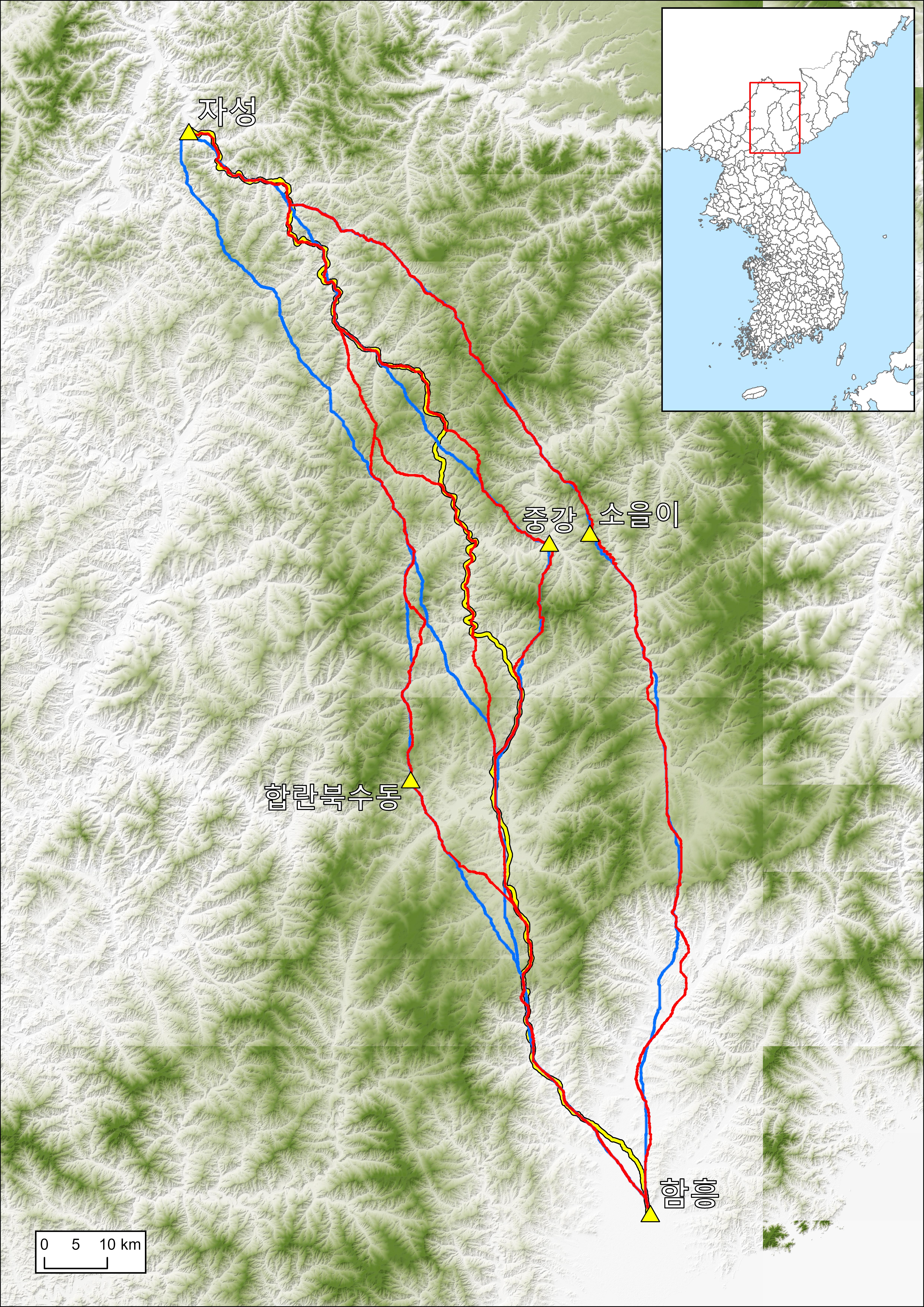 * 노란색 선: 1910년대 3차 지형도에 표시된 도로망. 자성-함흥 직통 경로만 표시