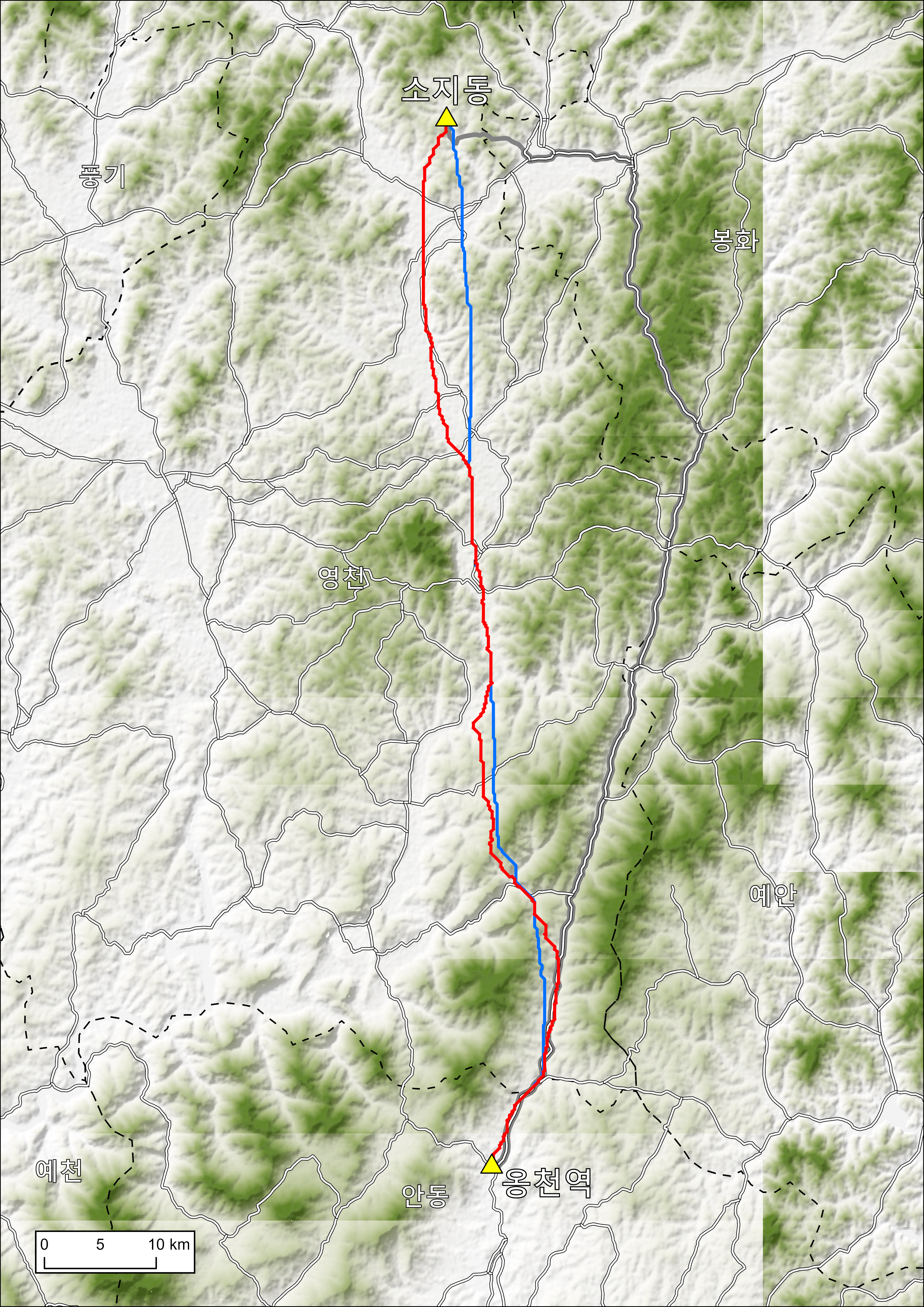 * 하얀색 실선: 1910년대 1:5만 지형도(3차 지형도)에 표시된 도로망(小路 등급 제외)